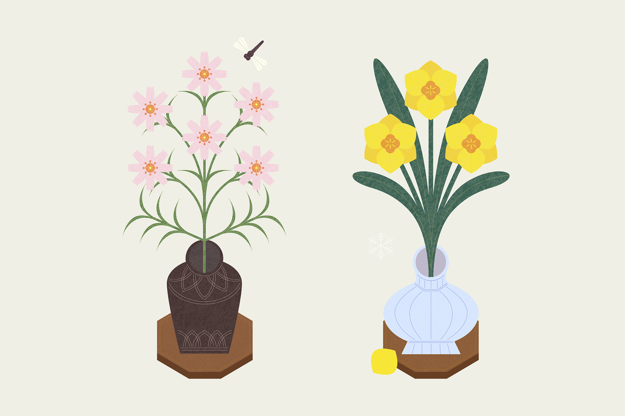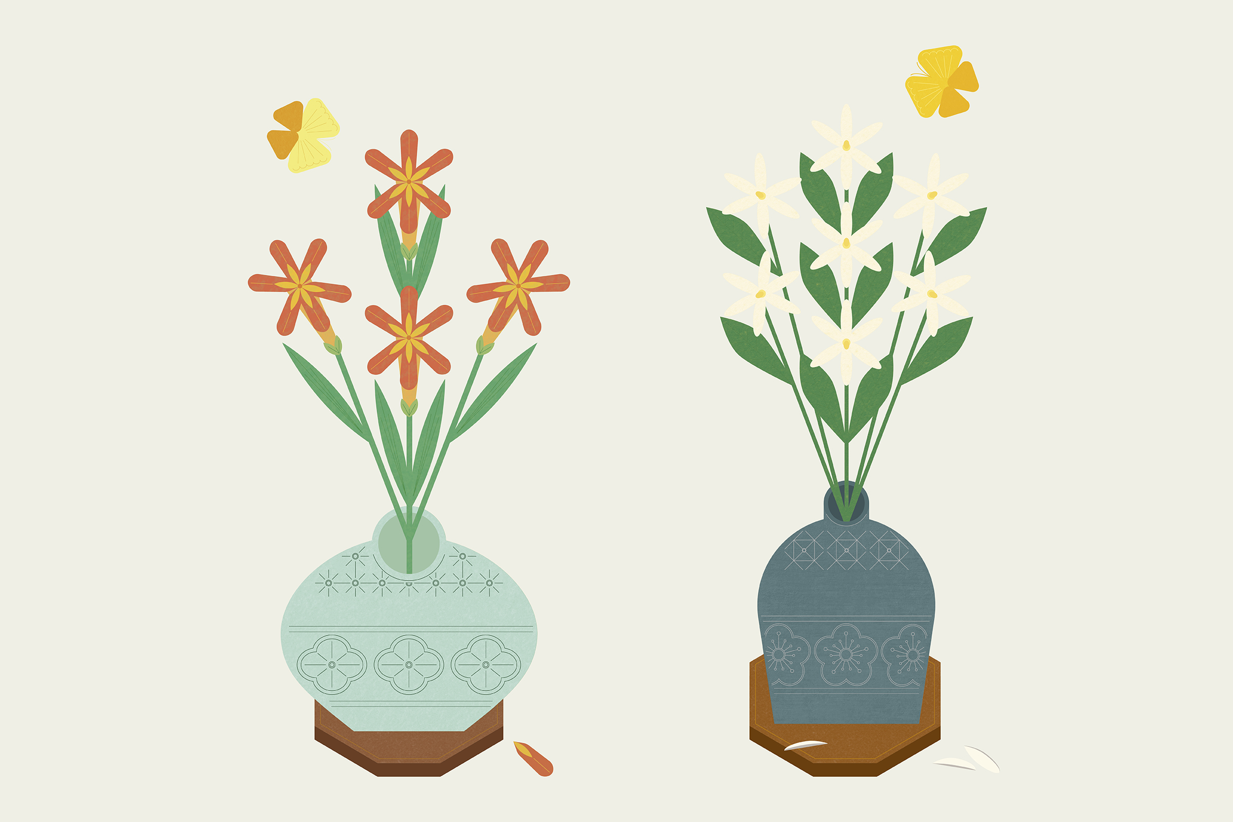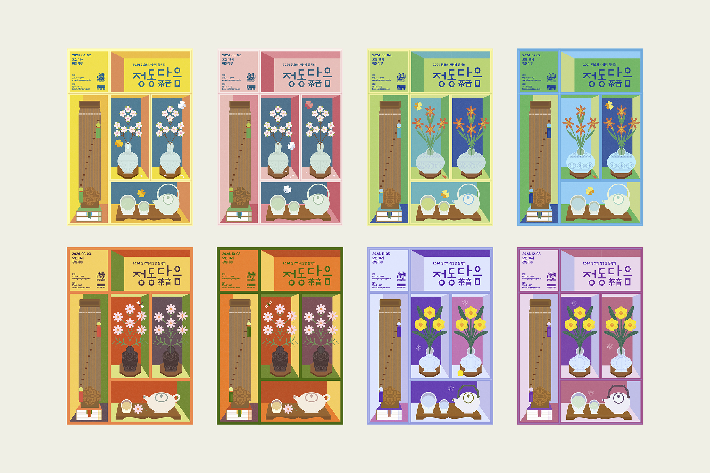 Chaekado, a traditional Korean painting of still objects in a study or on bookshelves, was the main source of inspiration. Each poster illustrates different types of tea and flowers, according to the four seasons of the year.
