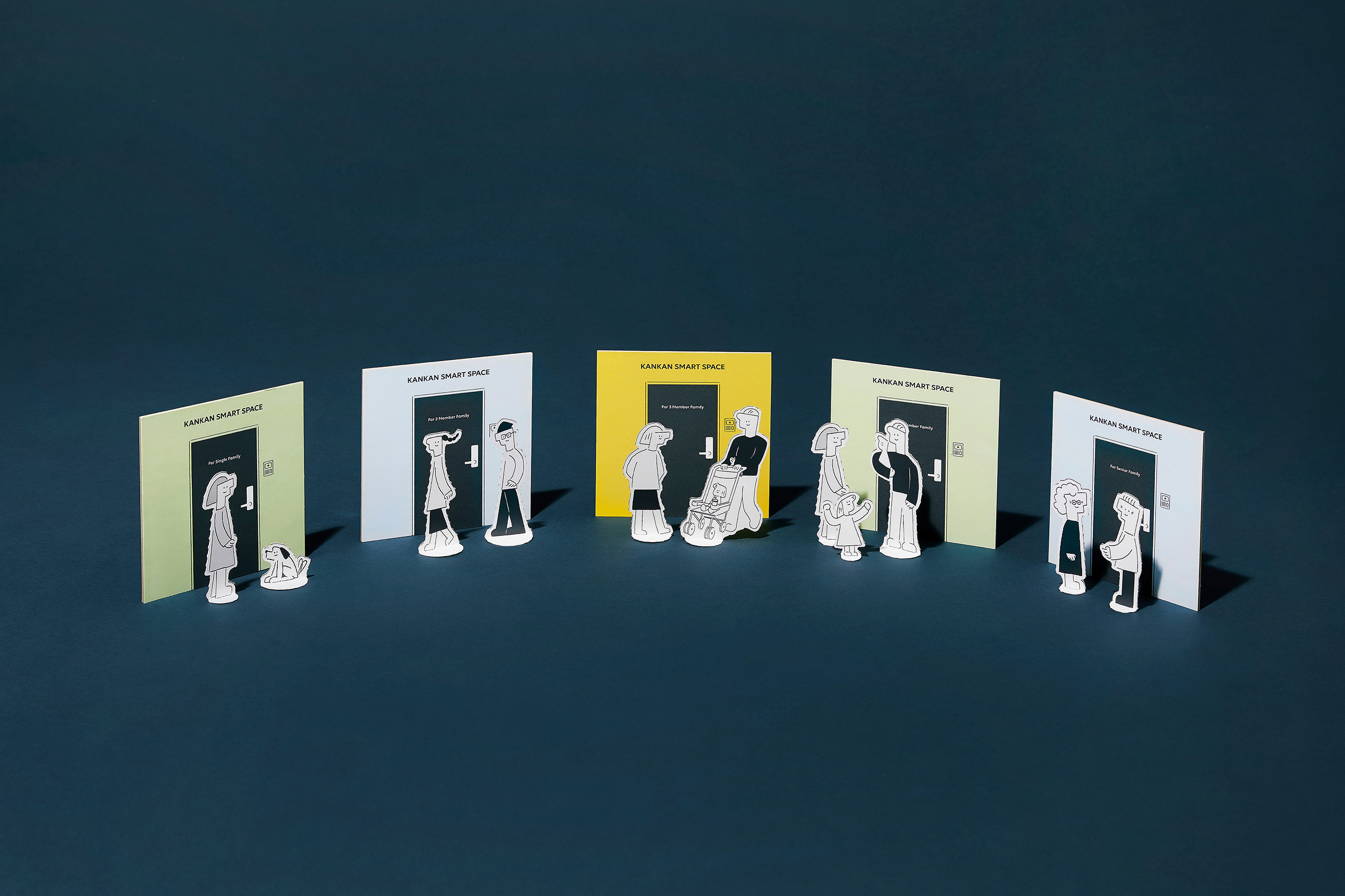 A brand developed as part of KOLON GLOBAL’s Pleasant Life Project. KANKAN SMART SPACE offers modular furniture designed to facilitate customization of the formulaic apartment spaces in Korea that leave minimal room for modification once they are built. Presented as the brand’s key visual is the KANKAN FAMILY, the characters of which were developed from the shapes of the KANKAN system furniture.KANKAN SMART SPACE provides customers with a KIT tailored to their family structure to offer a preview of the space before they move into an apartment. The KIT consists of a brochure, a pop-up book, a postcard, a pencil, and an eco-bag.A motion graphic demonstration of the KANKAN SMART SPACE assemblage is installed at the display apartments along with life-size furniture and figures of the KANKAN FAMILY characters for an elevated brand experience.