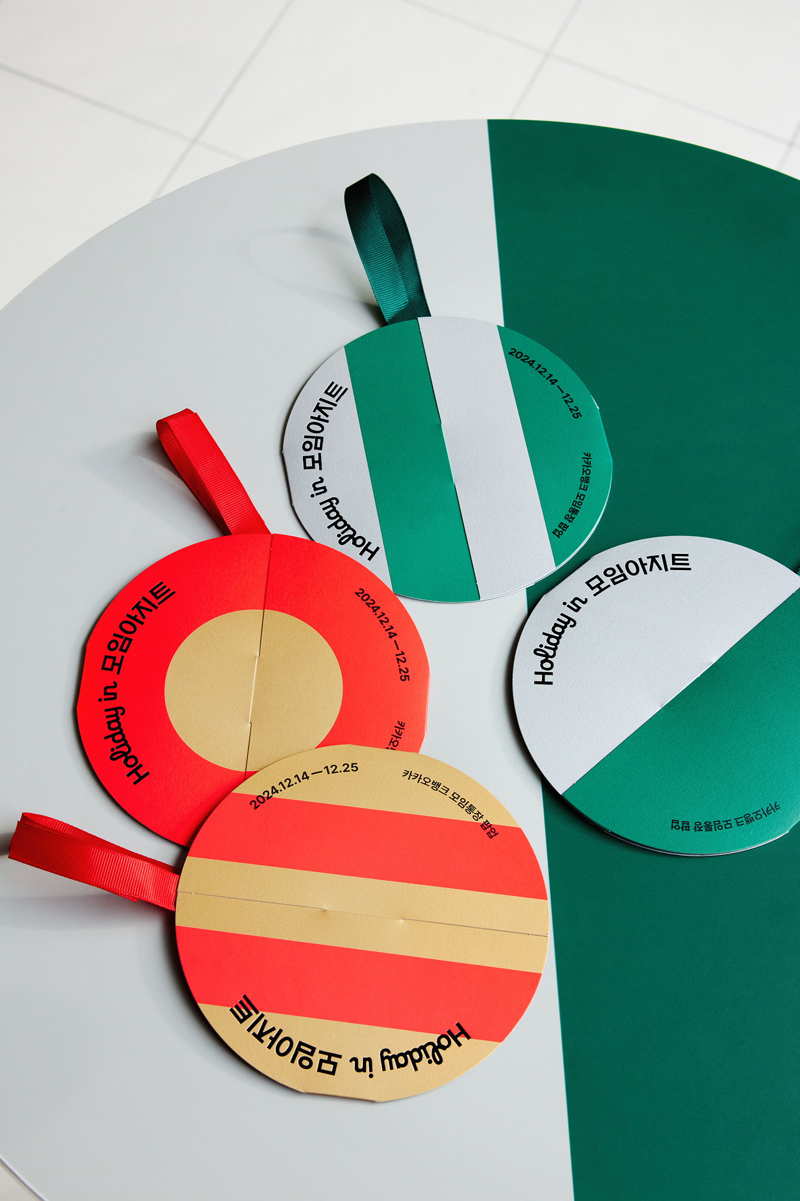 《Holiday in 모임아지트》의 메인 그래픽 콘셉트는 홀리데이 오너먼트입니다. 오너먼트의 스트라이프 패턴은 모임의 인원수를 나타냅니다. 연말 모임의 즐거움을 역동적으로 나타내는 소원 오너먼트들이 모여, 2024년의 안녕과 2025년을 기원하는 트리를 이룹니다.
